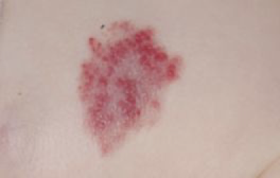 By a kind of small reddish or purple skin spot or strawberry mass on the face (most common) or in other places of the body, at birth or during the first weeks of life.